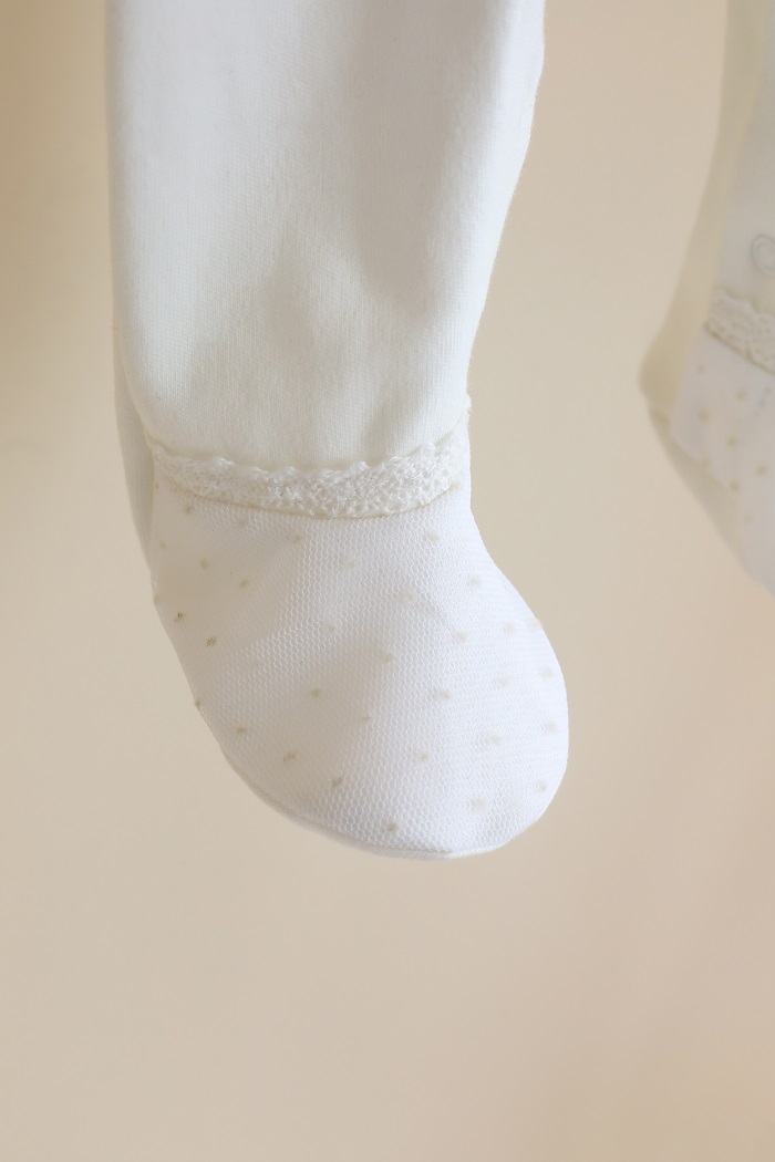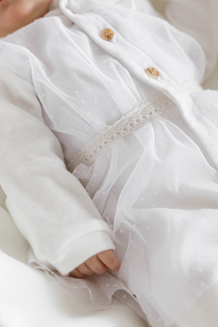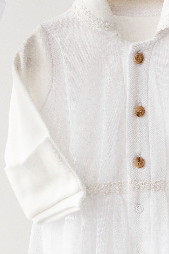 Спереду чоловічок має м’який фатиновий декор у вигляді сукні та оздоблення з натурального мережева. На спинці ж такого декору немає. Чому так? Бо добре знаємо, що малеча у цьому віці не ходить і багато лежить на спинці.