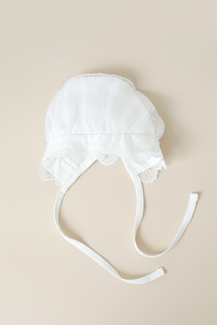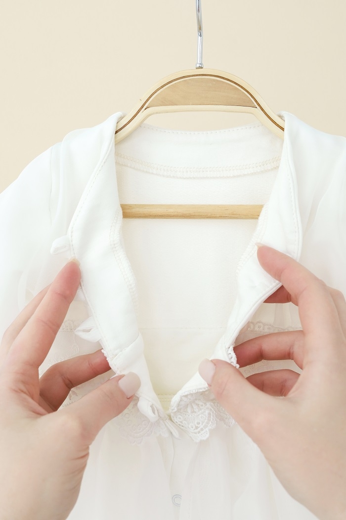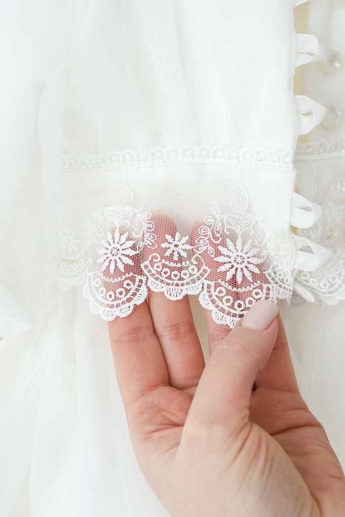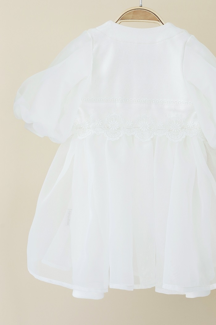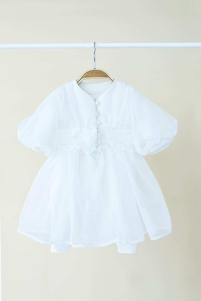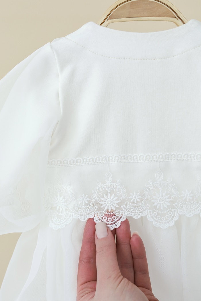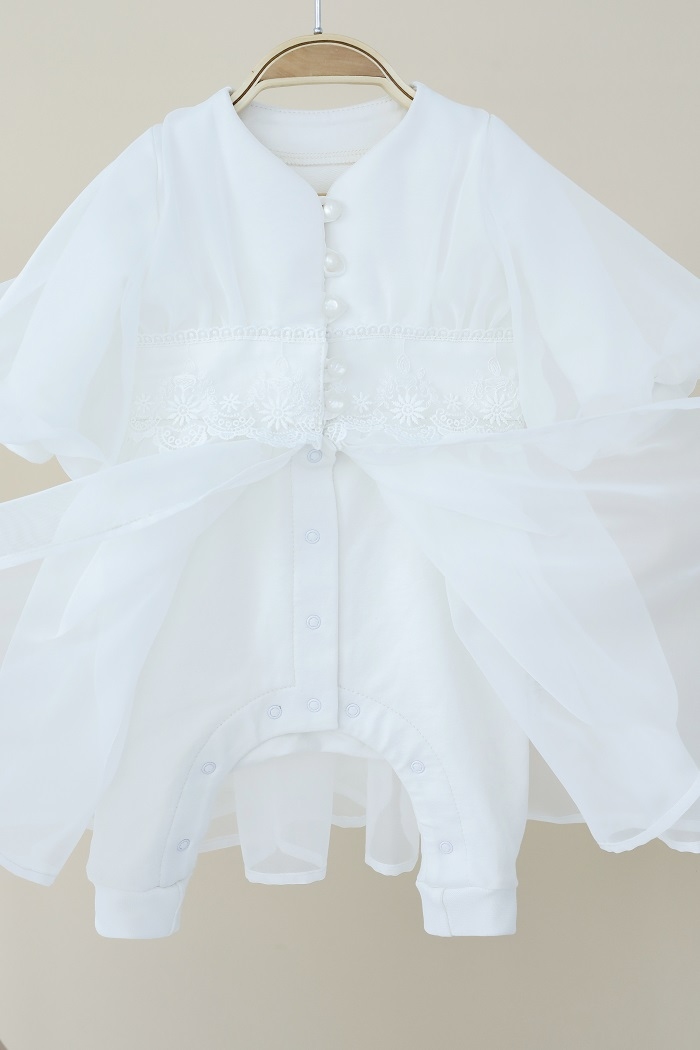 Воздушный шифон словно облако окутывает малыша, кружево похоже на мерцание звезд, а нежные пуговицы — как жемчужины добрых волшебниц.