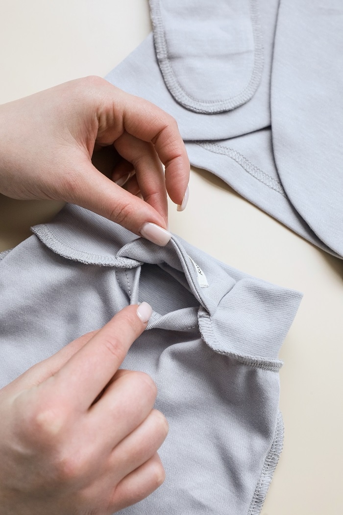 Имеет конструктивно разработанный легкий доступ к пупочному ранку. Это означает, что ткань не будет мешать, а ранка будет контактировать с воздухом и быстрее заживет. Когда пупочок отпадет, вещи можно еще носить как обычные.