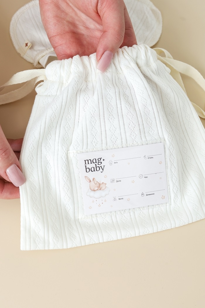 Мешочек для хранения первой одежды с биркой, где можно вписать дату рождения, рост, вес, имя малыша. -