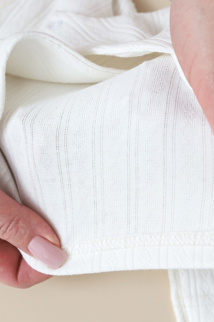 Сшит из 100% хлопка — гладкого интерлока. Натуральная ткань не вызывает аллергии, позволяет коже дышать и не парит.