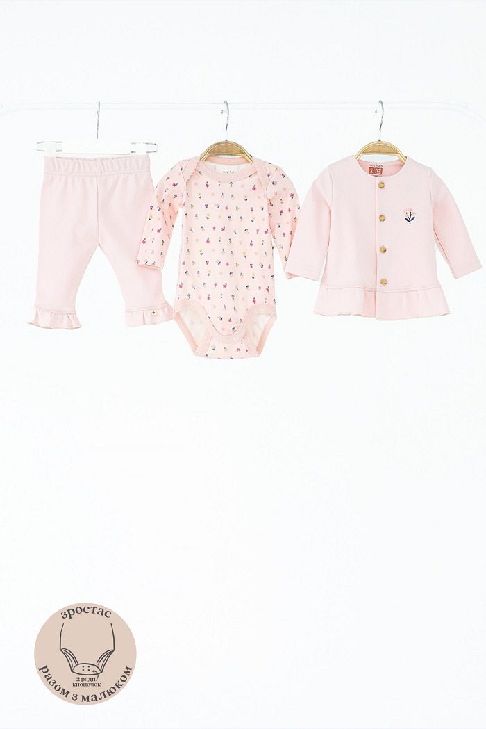 Нежный боди с милым принтом, удобные штанишки с воланами и блузка со сказочной вышивкой – идеальное сочетание для первых улыбок, объятий и солнечных приключений. В комплект входит: