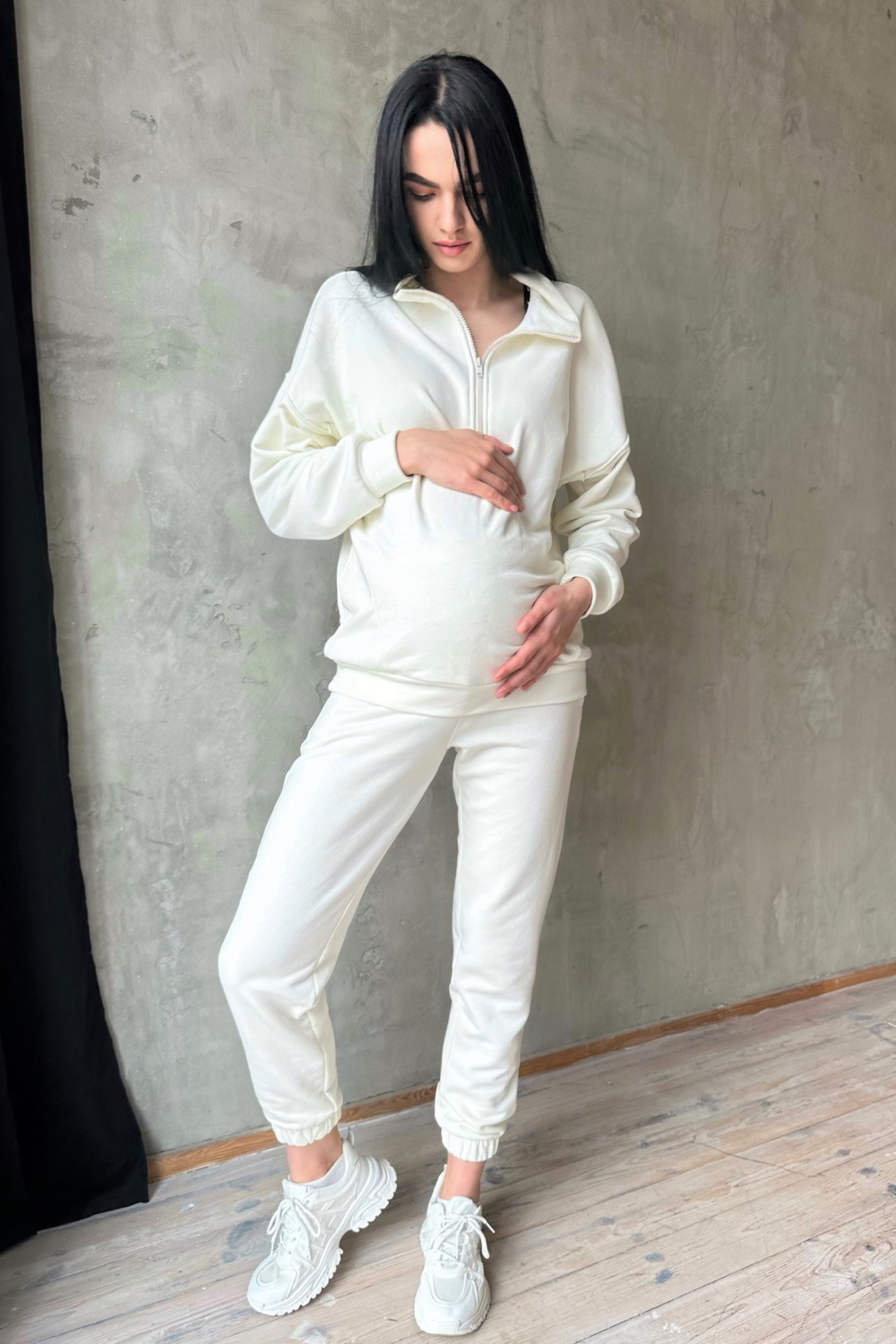 Спортивный костюм для беременных женщин и кормящих мамочек со скрытыми молниями по бокам для удобного кормления. Костюм сделан из высококачественного трикотажа, нежного цвета. Брюки с высокой посадкой и резиночкой, регулируемой по мере роста животика.