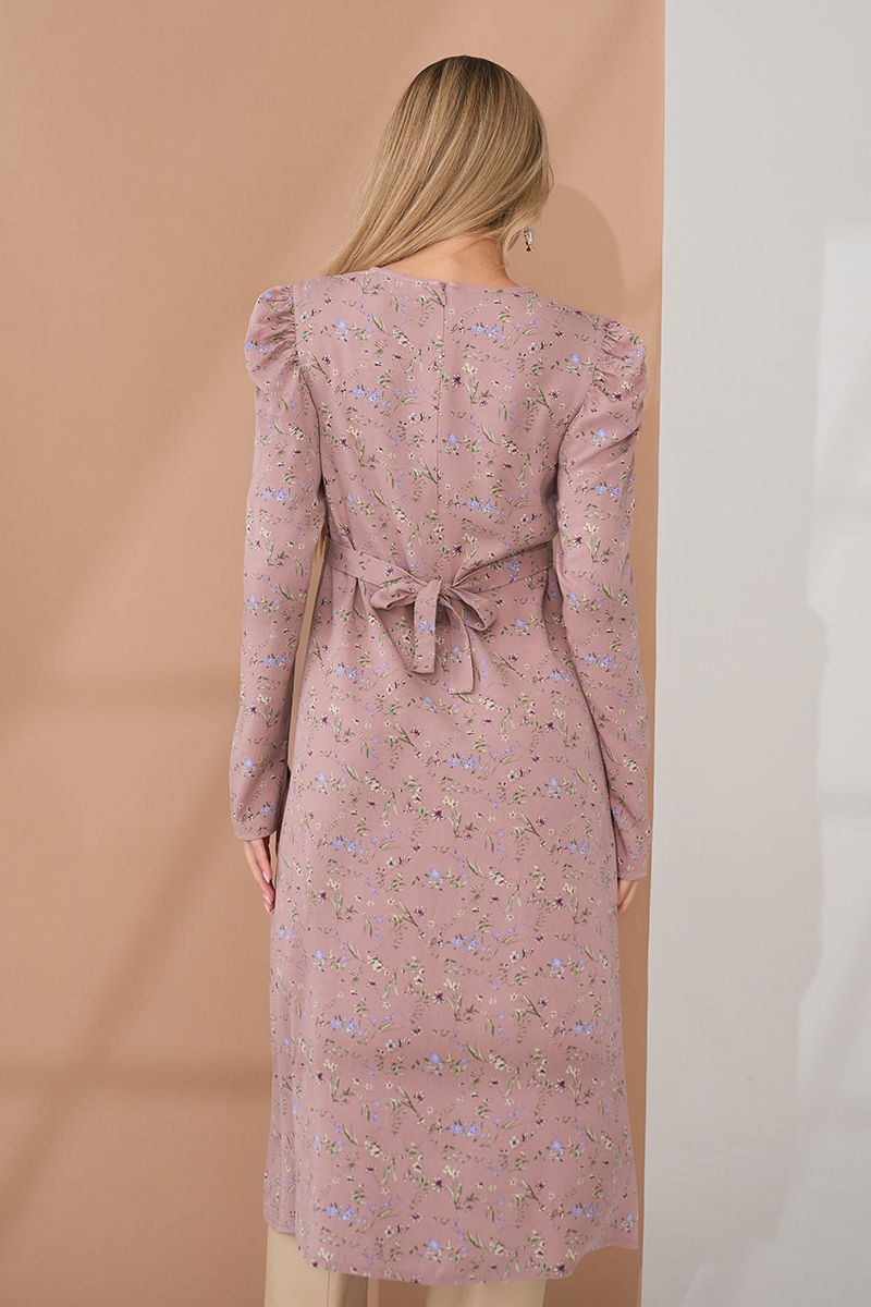 Отделка: рукава-буфы и эффектный разрез на юбке, смещенный в левую сторону.
